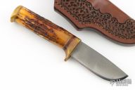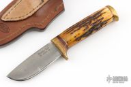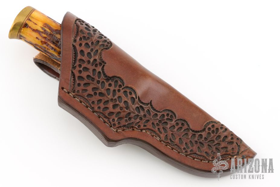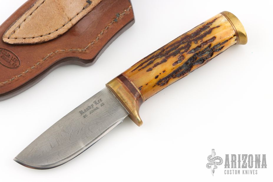 This knife by Randy Lee features an antiqued blade with .062" blade stock and 1" blade depth, hidden tang construction. The handle has a brass guard and butt, stag grip with red/brass/ironwood spacers. Includes a hand tooled brown leather sheath with belt loop. Excellent condition.