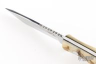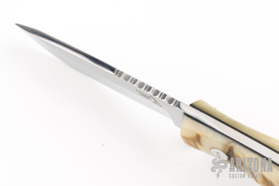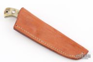 This custom knife by Keith Murr features a drop point blade with a fileworked thumbrest, .139" blade stock, .898" blade depth, full tang construction. The handle has sheep horn scales with black liners and aluminum pins. Excellent condition. Includes a brown leather sheath.