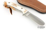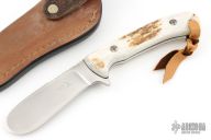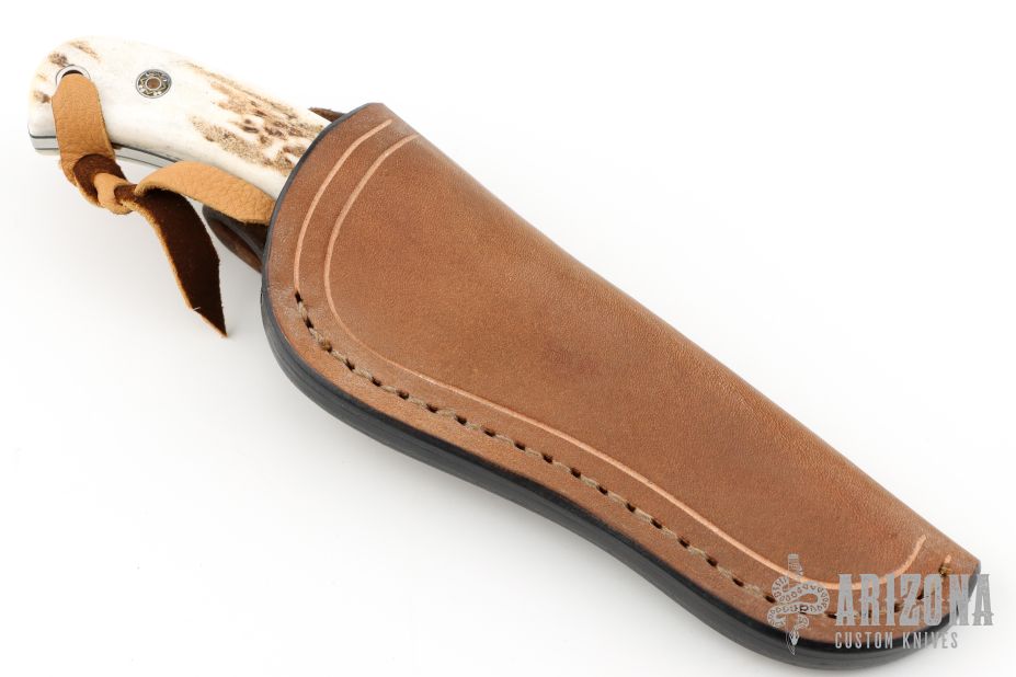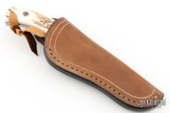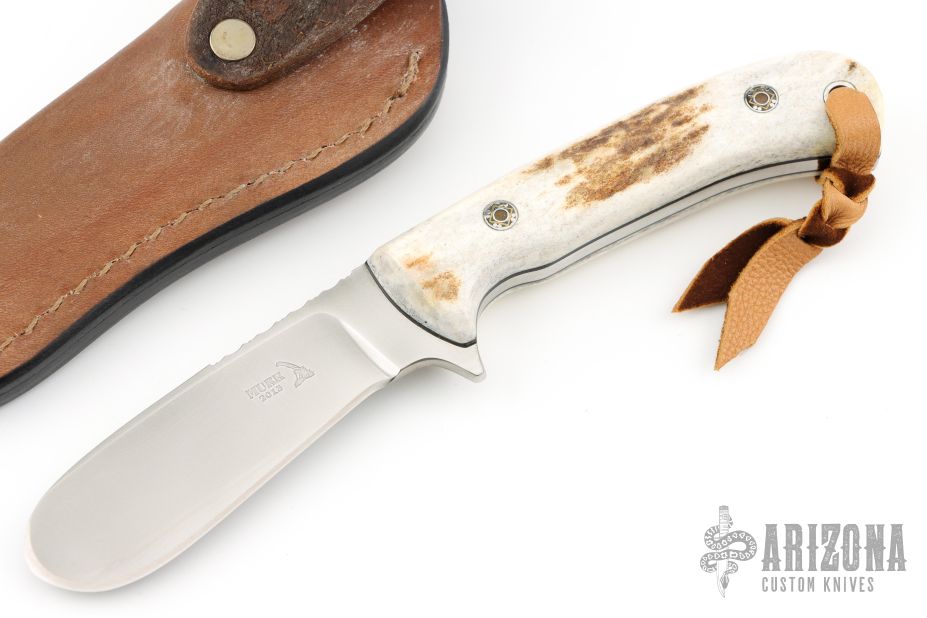 This custom knife by Keith Murr features a drop point blade with a fileworked thumbrest, .147" blade stock, 1.047" blade depth, full tang construction. The handle has stag scales with black liners and mosaic pins. Excellent condition. Includes a brown leather sheath.