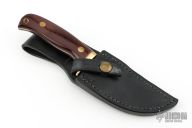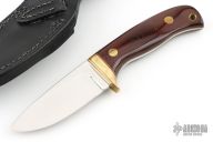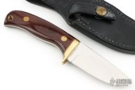 The Skinner by Don Hethcoat features a mirror polished blade with .170" blade stock and 1.252" blade depth, full tapered tang construction. The handle has a brass guard and maroon linen micarta scales with red and brass liners and brass pins. Comes with a black leather sheath. 79-106 on the blade. Excellent condition.