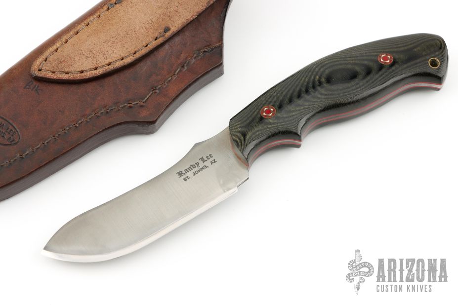 Randy’s fascination with knives began as a young man when he made his first knife in a high school “metals” class. He collected them for years and eventually began making his own to get a better edge-holding skinner for hunting. Randy read books and visited local makers to learn the craft. In 1979, he decided to invest in shop equipment so that he could properly master his knife making skills. In a few years, he was making and selling knives to local hunters, while continually developing his style and craftsmanship. He attended his first knife show in 1986 and has been participating in about six shows each year since then. As an avid hunter, Randy knows how a good hunting knife should perform. He loves to “field-test” his designs and feels that a quality knife should not only look great, but perform well as a tool. He offers a wide variety of knife styles; from utility hunters and fighters to collector pieces such as daggers and bowies. Although the actual work of grinding and buffing knives is very tedious, he always finds it rewarding to see the final finished product. Randy particularly enjoys meeting people who find knives as interesting and exciting as he does. Randy’s wife, Sonja Lee, is one of the premier sheath makers in the business. Using exotic hides, or leather and various forms of tooling, she has mastered the craft of sheath making. Sonja creates the custom sheaths which are provided for each of Randy Lee’s knives and she is now making custom sheaths for many other knife makers and collectors.