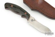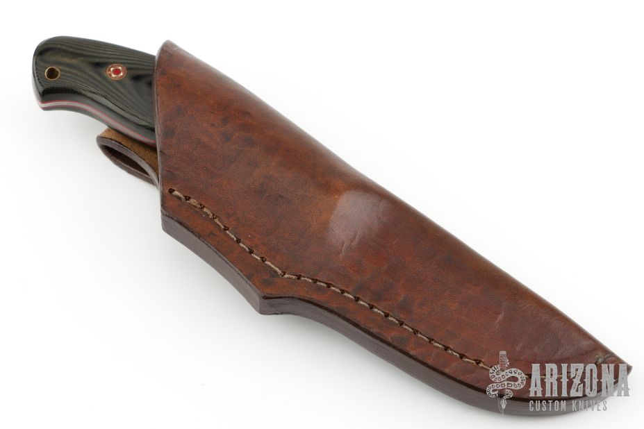 This knife by Randy Lee features an antiqued blade with .069" blade stock and 1.126" blade depth, full tang construction. The handle has black linen micarta scales with red liners, mosaic pins. Lanyard tube in pommel. Includes a brown leather sheath with belt loop. Excellent condition.