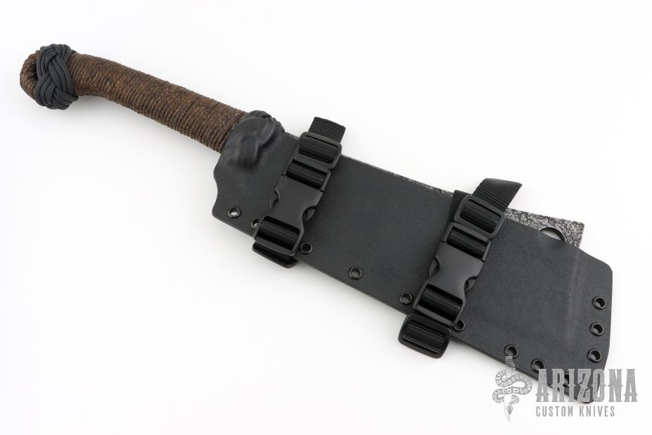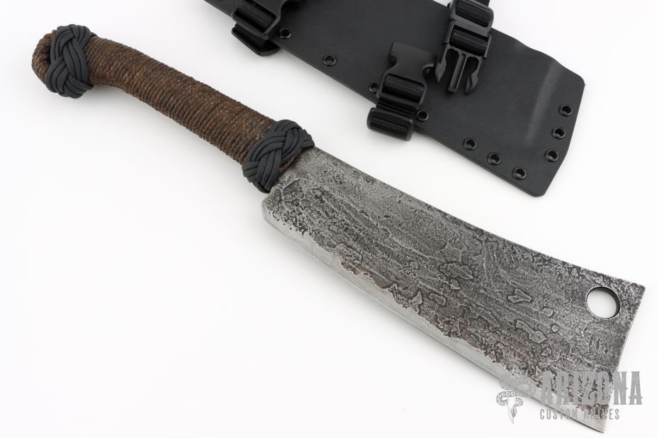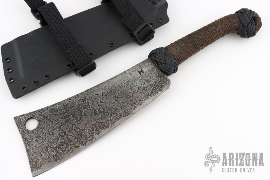 This Cleaver by James Helm features a hand forged clip point upswept blade with .264" blade stock and 3.5" blade depth, hidden tang construction. The handle has hemp/cord wrap. Comes with a kydex sheath. New from Maker!