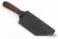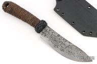 This knife by James Helm features a hand forged blade, .160" blade stock and 1.604" blade depth, hidden tang construction. The handle has a paracord/hemp wrap that has been epoxied. Comes with a kydex sheath set up for TekLok. New from Maker!