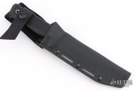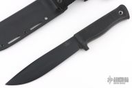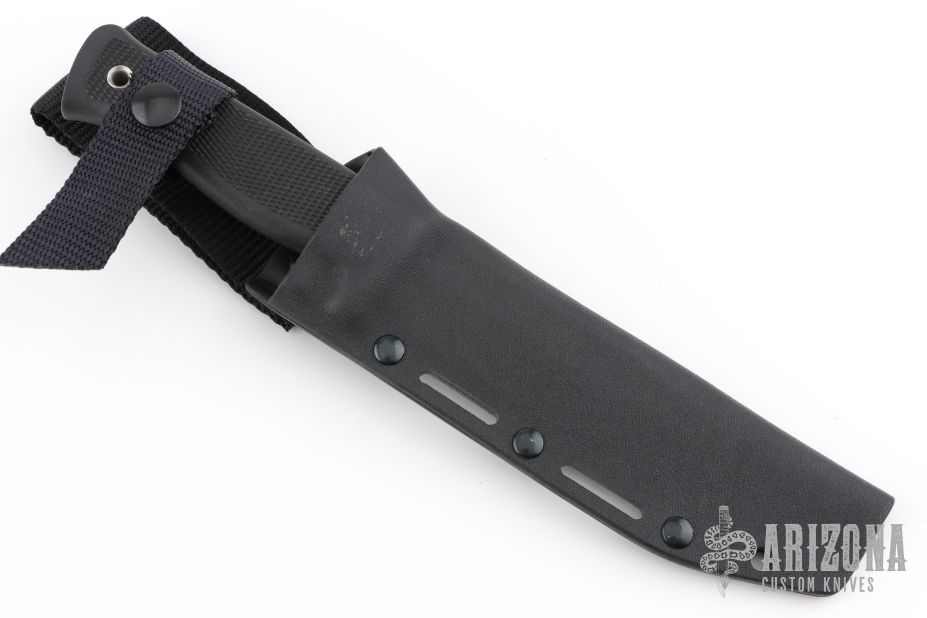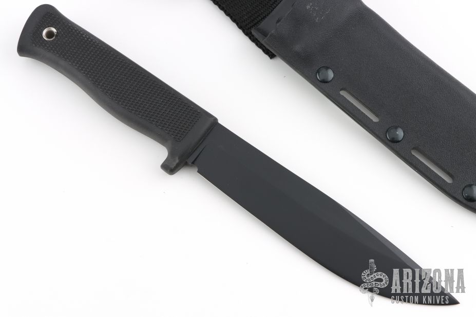 The Model A1 by Fallkniven is a semi-large all-purpose knife for heavy duty use. The powerful blade is made of extremely hard yet tough laminated VG10 steel and will withstand the stress of hard use. The knife is superb to chop with, but also works very well with daily tasks, thanks to the ergonomic grip. The full tang goes entirely through the handle, so you can strike the end of it without breaking the grip. The sturdy black zytel sheath allows you to fasten the knife on your belt or your pack - even upside down. Model A1 is a water repelling concept which works just as well in extreme cold as in stifling heat. Has a black ceracoated spear point blade with false top edge, .236" thick and 1.291" deep. Comes with black nylon/kydex sheath. Has some light scuffs, excellent condition otherwise.