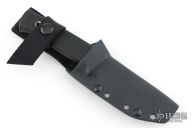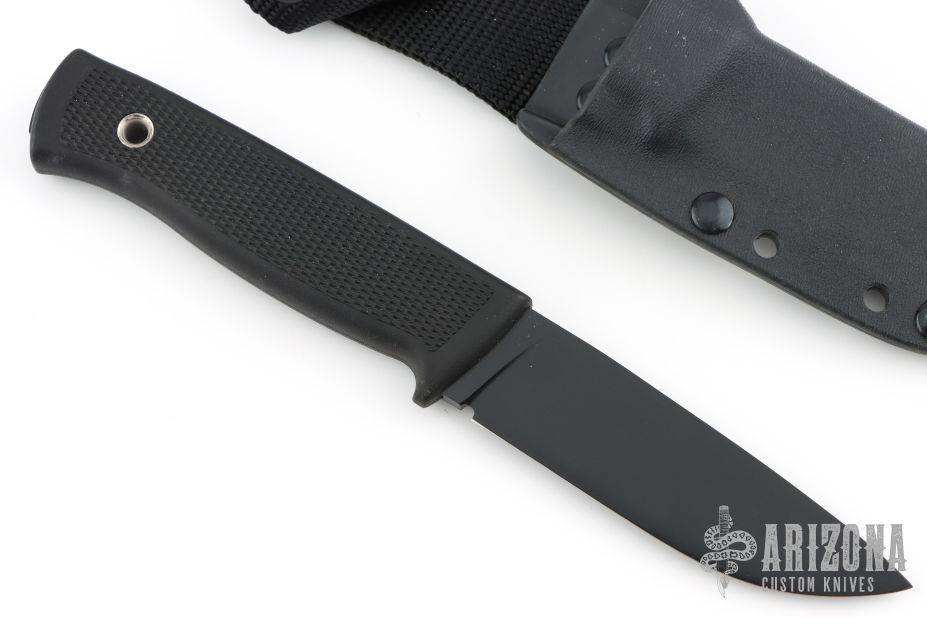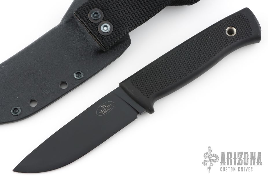 This Model F1 features a Laminated VG10 blade with a black finish. .179" blade stock and 1.062" blade depth. Hidden tang construction. Rubber handle with the end of the tang protruding through the butt. Comes with a black plastic/nylon sheath and original box. Has a couple light scuffs, excellent condition otherwise.