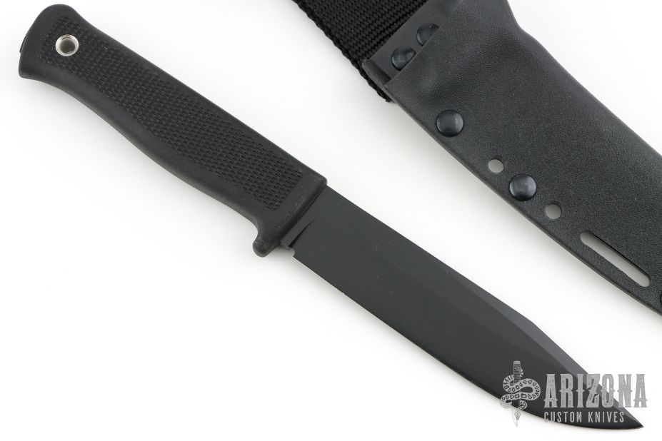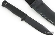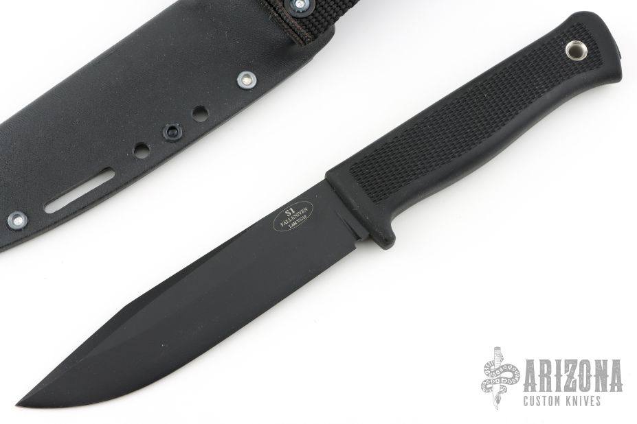 This Model S1 Forest Knife features a Laminated 420 and VG10 Core with a black coating, .197" blade stock and 1.138" blade depth. Hidden tang construction. Zytel handle with the end of the tang protruding through the butt. Comes with a black molded plastic/nylon sheath and original box. Has a couple light scuffs, otherwise Excellent condition.