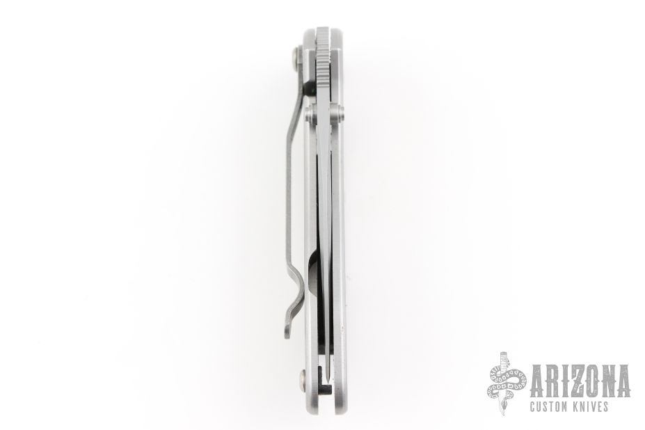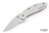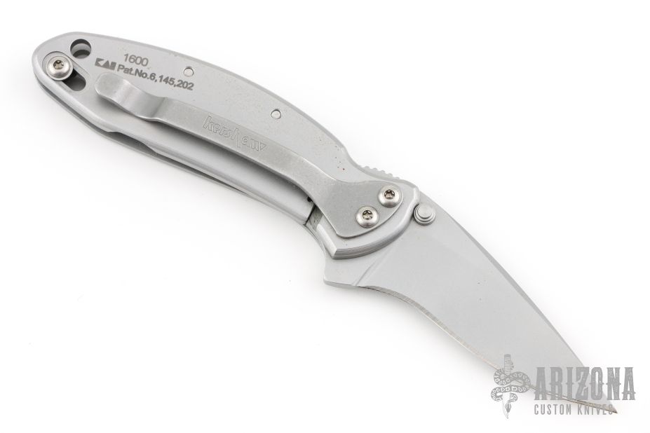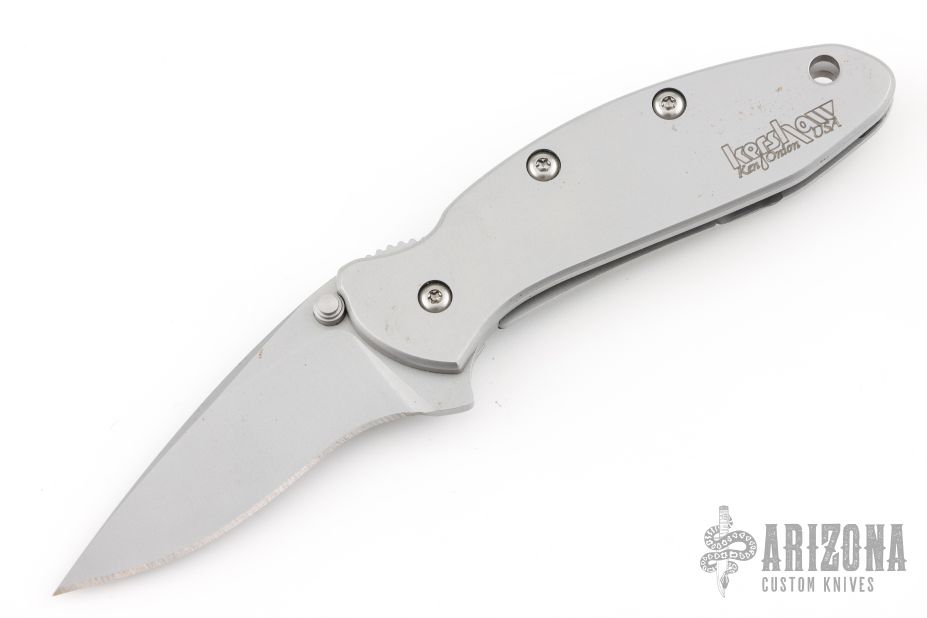 This Chive by Kershaw knives has a bead blast blade with notched thumbrest and flipper. The handle has a bead blast aluminum frame and tip down clip. Has some scuffs, scratches, and some patina. Good condition otherwise.