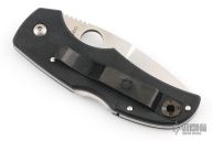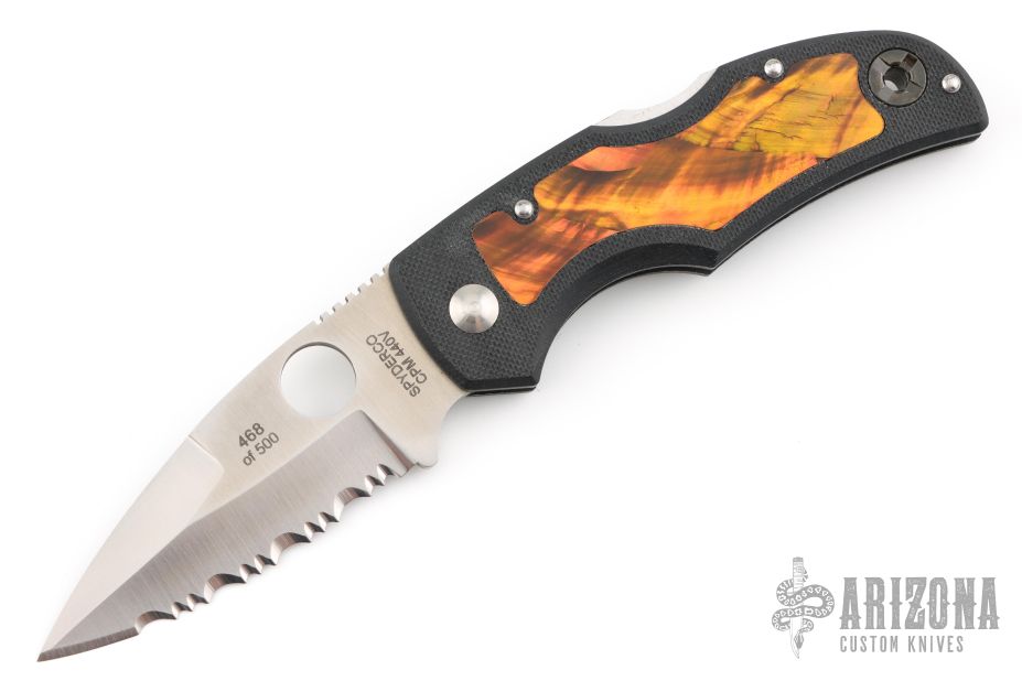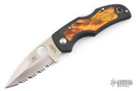 This Native folder by Spyderco Knives has a satin finish blade with thumbhole, notched thumb rest, and serrations. The handle has black G-10 scales, stainless steel liners, and a reversible stainless steel clip. Nice smooth action. Comes with original box and papers. Excellent condition. Limited edition version with "root beer" inlay.