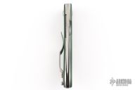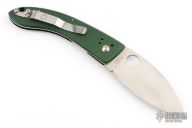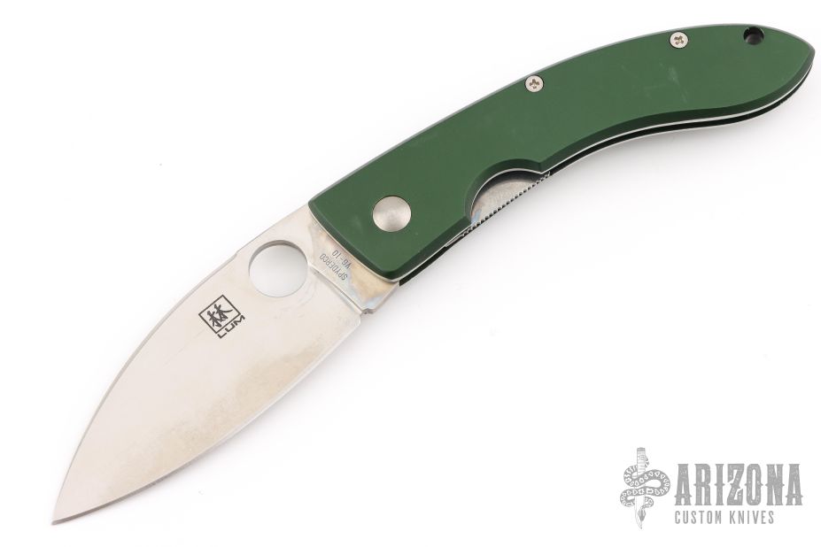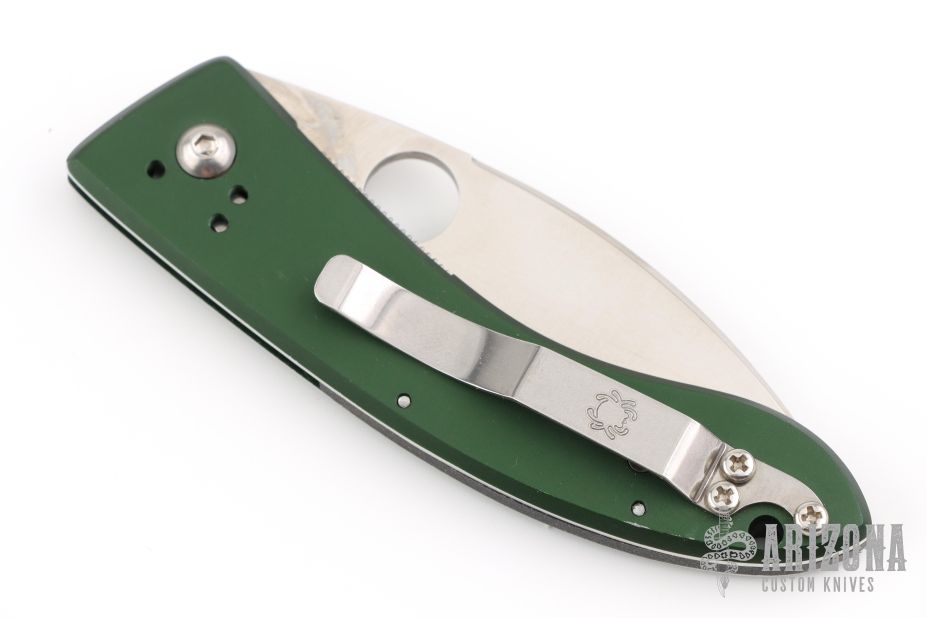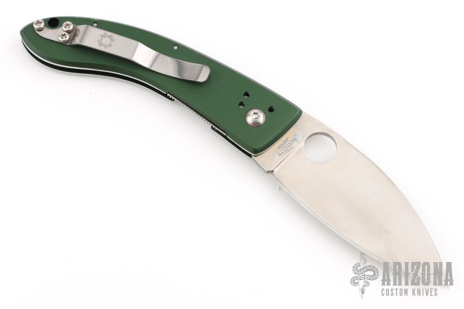 This Bob Lum Chinese folder by Spyderco, has a satin plain edge blade and green aluminum handle with a tip up or down reversible stainless steel clip. Titanium liners, and black backstrap with lanyard hole in pommel. Has some light scuffs, excellent condition otherwise.
