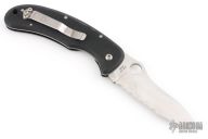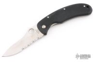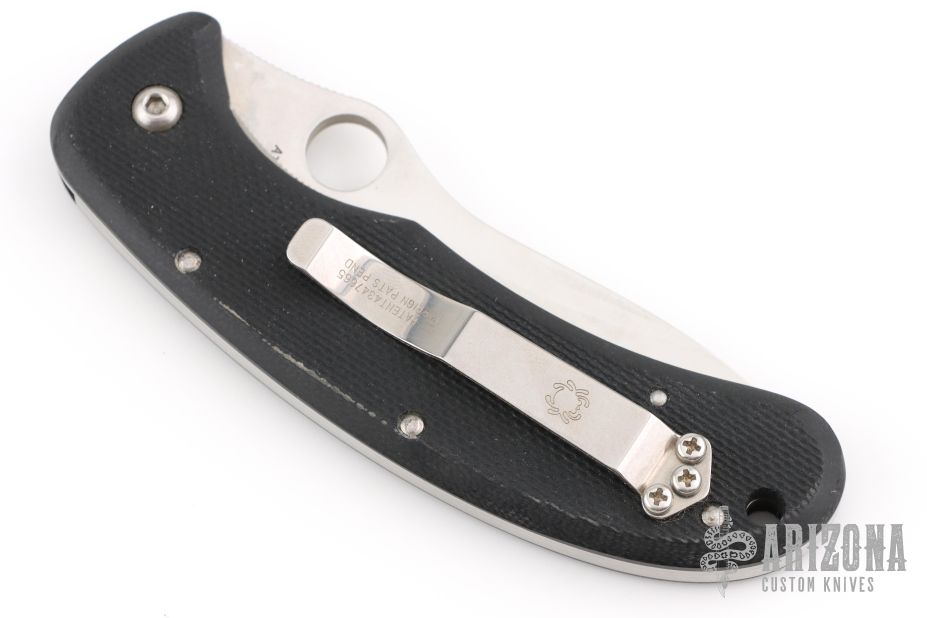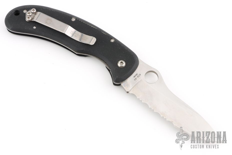 The Tim Wegner C48S by Spyderco is a very collectable Spyderco knife that has been discontinued and is designed to be a hunter with its large hunter trailing point blade. Tim Wegner ended up producing this knife with Blade Tech. Partially serrated and satin finished blade, ATS34. Textured black G10 handle. Stainless tip up carry clip and liner. Has a nice detent, lockup and blade seating. Has some light scuffs and scratches, great condition otherwise.