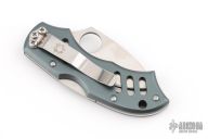 This Navigator by Spyderco features a satin finished blade with thumbhole. The handle has a grey aluminum frame with tip down stainless steel clip. Has a couple light scuffs and scratches, excellent condition otherwise.