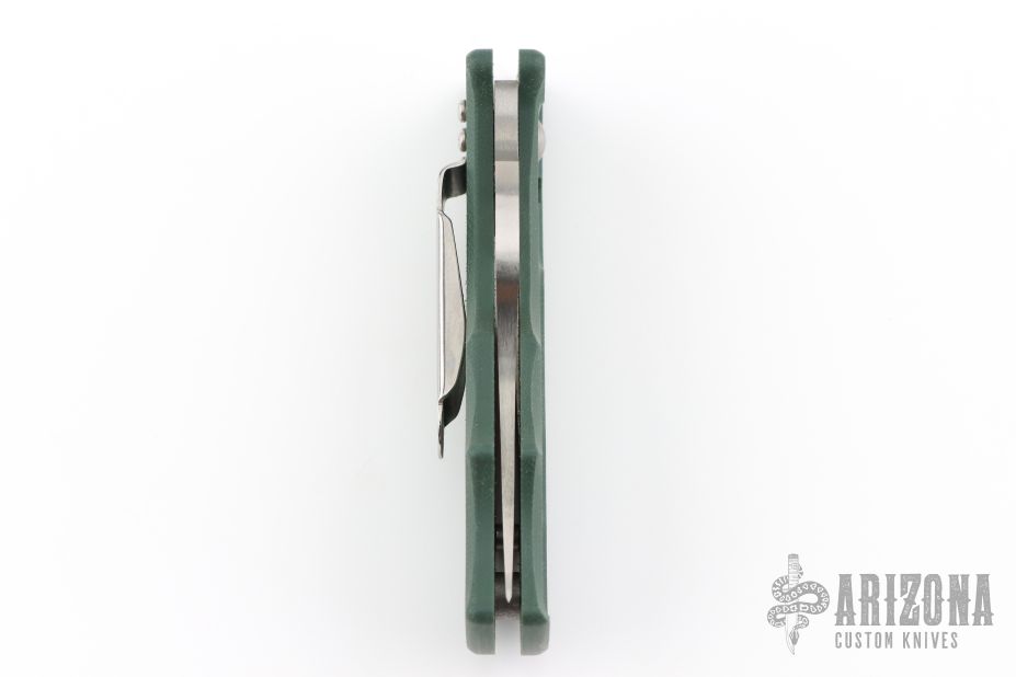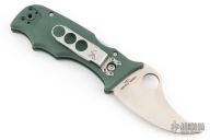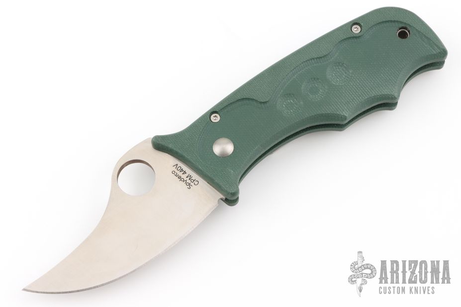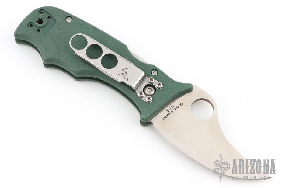 This Lil Temperance by Spyderco has a satin finished trailing point blade with thumbhole. The handle has green G-10 scales, stainless liners and tip up or down reversible clip and lanyard hole in pommel. Has a couple light scuffs, excellent condition otherwise.