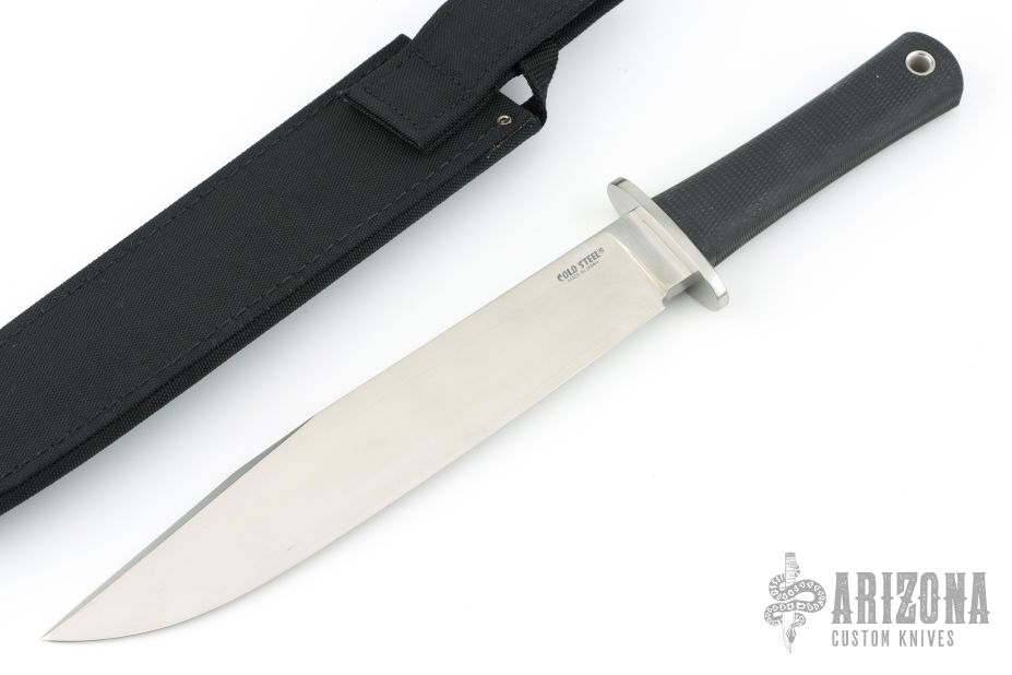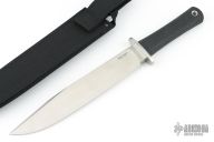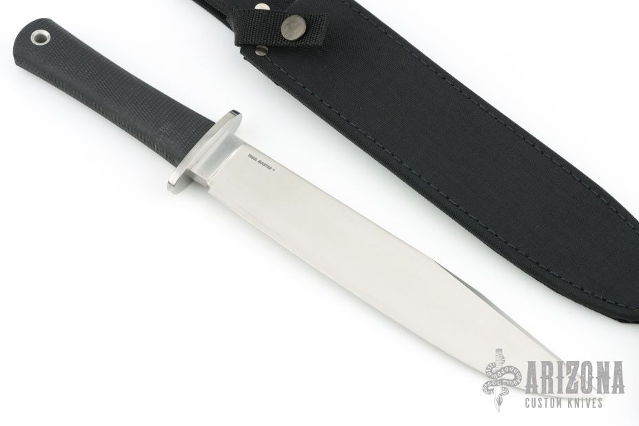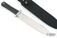 This Trail Master bowie by Cold Steel features a satin finished clip point blade with a false top edge, .307" blade stock and 1.552" blade depth, hidden tang construction. The handle has a stainless steel guard and a rubber handle. Excellent condition. comes with original box and black nylon sheath.