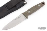 This Cuda CQB2 is a Bob Terzuola design executed by Camillus. It features a bead blasted spear point blade with false top edge, notched thumb ramp, .120" blade stock and 1.122" blade depth, full tang construction. The handle is comprised of green canvas micarta scales with lanyard hole over notched tang. Includes original box, papers, and leather sheath. Has some light scuffs, excellent condition otherwise.