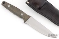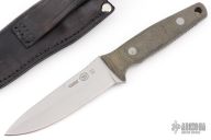 This Cuda CQB2 is a Bob Terzuola design executed by Camillus. It features a bead blasted spear point blade with false top edge, notched thumb ramp, .119" blade stock and 1.114" blade depth, full tang construction. The handle is comprised of green canvas micarta scales with lanyard hole over notched tang. Includes original box, papers, and leather sheath. Has some light scuffs and scratches great condition otherwise.