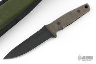 This Cuda CQB2 is a Bob Terzuola design executed by Camillus. It features a black coated spear point blade with false top edge, notched thumb ramp, .148" blade stock and 1.140" blade depth, full tang construction. The handle is comprised of green canvas micarta scales with lanyard hole over notched tang. Includes original box, papers, and nylon belt sheath. Excellent condition.