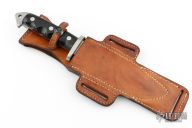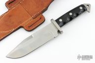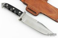This bowie by Rose Creek Made features a satin finished blade with sharpened top edge, .258" blade stock and 1.777" blade depth, full tang construction. The handle has a steel guard with black linen micarta scales, extended tang with a lanyard hole. Comes with a brown leather sheath made by Randy Rains. Stamped "LL" on the blade. Has a couple small oxidation spots and a couple light scratches, otherwise good condition.