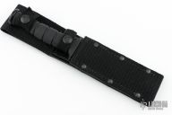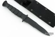 This knife by Ontario features a black blade with sharpened top edge, .165" blade stock and 1.037" blade depth, hidden tang construction. Rubber handle with black stainless steel butt. Comes with original nylon sheath. Excellent condition.