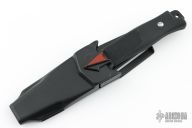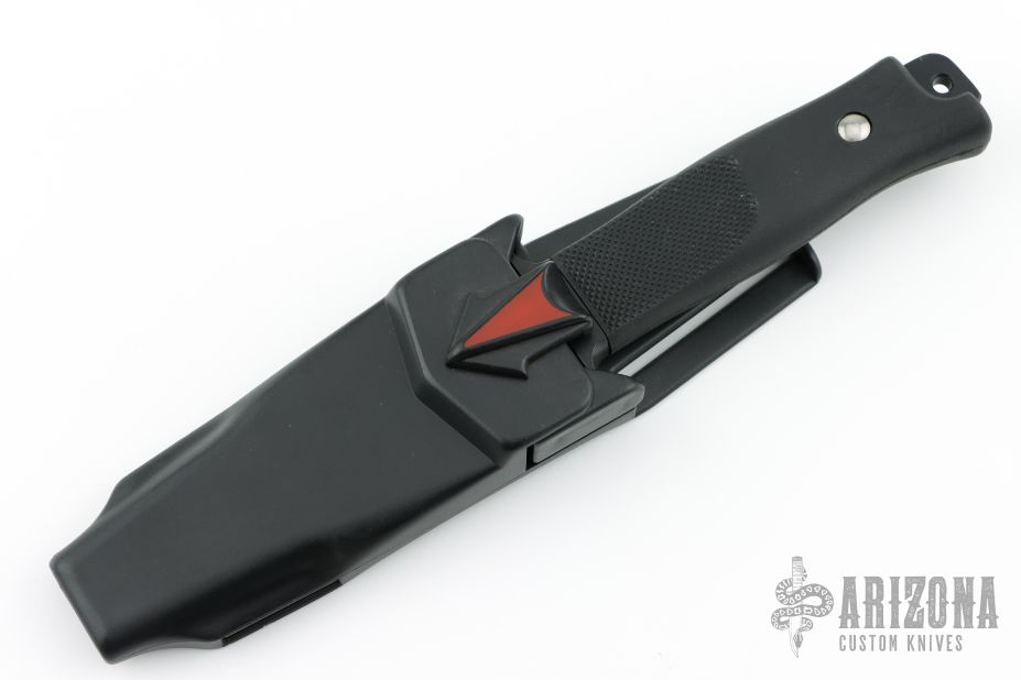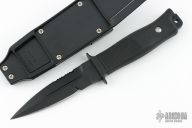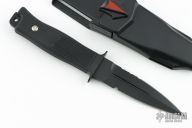 This Dive Knife by T.S. Corp features a black double edged blade with one partially serrated edge and fullers, .199" blade stock and 1.031" blade depth, hidden tang construction. The handle has a black steel guard, rubber grip, extended tang with lanyard hole. Comes with a locking plastic sheath. Excellent condition.