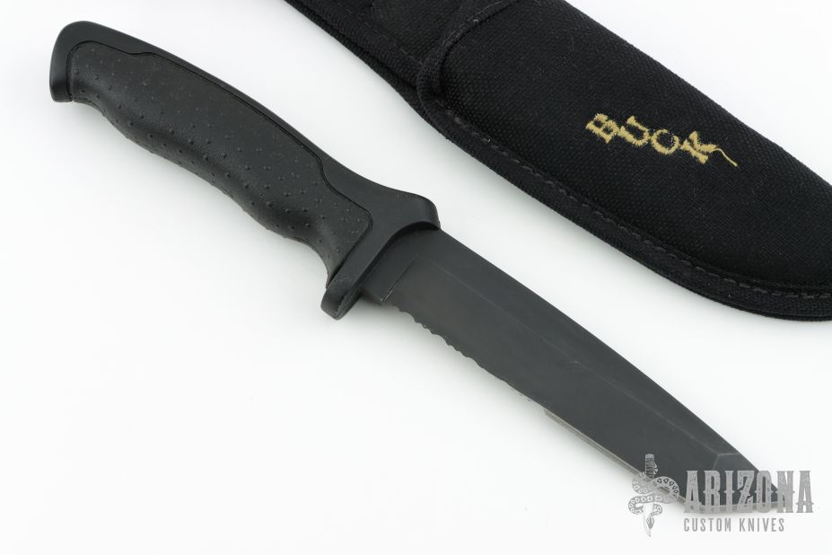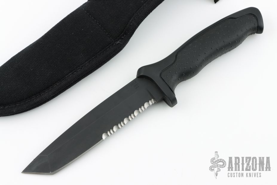 This Night Hawk by Buck Knives features a black tanto partially serrated blade with false top edge, .235" blade stock and 1.222" blade depth, hidden tang construction with a rubber grip. Comes with original black nylon sheath. Has a few light scuffs, otherwise excellent condition.