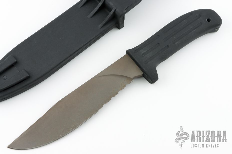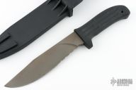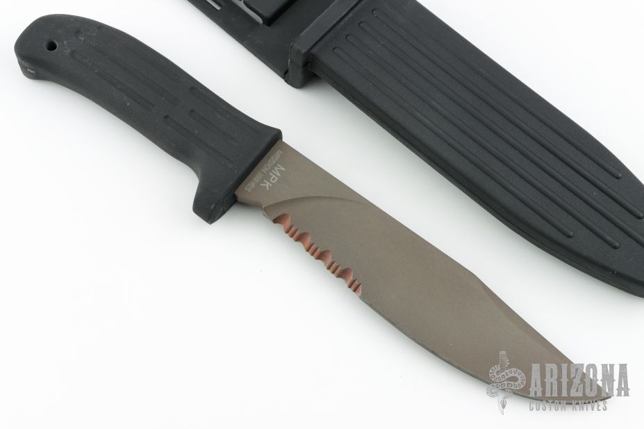 This MPK from Mission Knives features a clip point titanium partially serrated blade with bead blasted and anodized finish made from titanium, .244" blade stock and 1.560" blade depth, hidden tang construction. The handle is comprised of an black Kevlar strengthened kytrel. Lanyard hole on the pommel. Includes original sheath. Has some light scuffs, otherwise excellent condition. Comes with original box and leg straps.