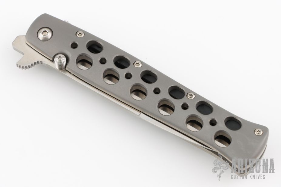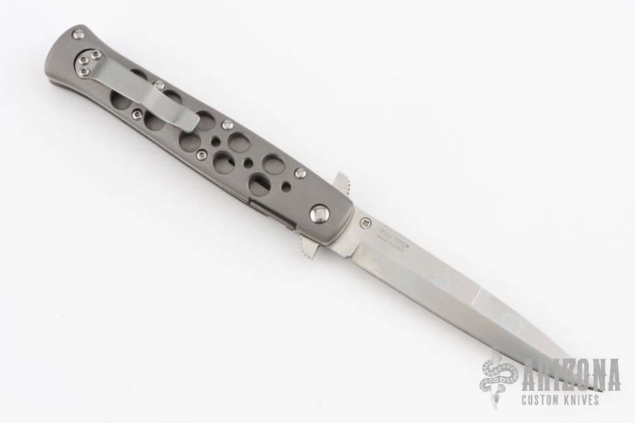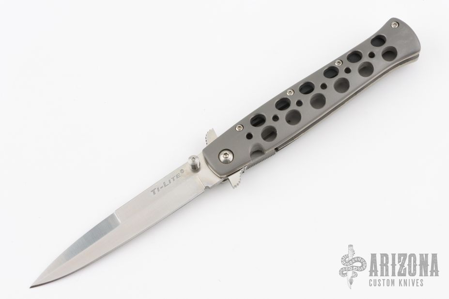 This Ti-Lite by Cold Steel features a satin finished blade with false top edge and single thumbstud. Bead blasted titanium handle with a single titanium liner and a bead blasted tip up stainless steel clip. Excellent condition. Comes with original box.