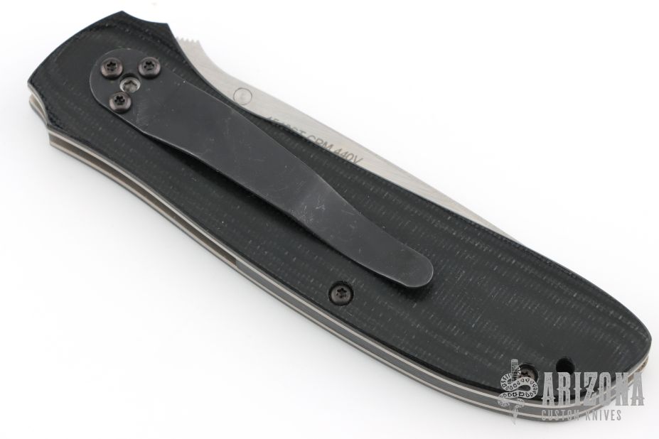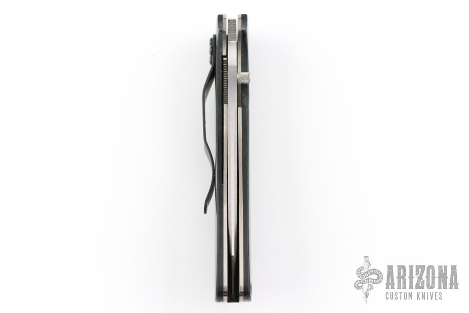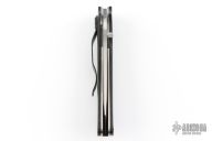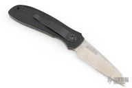 This Random Task Assisted Opening Linerlock Folder has a satin finished CPM 440V stainless steel wharncliffe blade with partial serrations, single thumbstud and notched thumb rest. Handle is black polished G10 with titanium liners, black G-10 backspacer, bead blasted titanium tip down clip, and lanyard hole. Excellent condition. Discontinued due to high cost of manufacturing, lots of hand done work. Comes with original box and papers.
