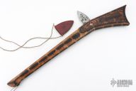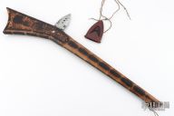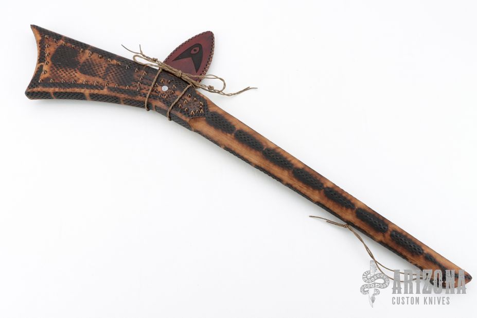 Straight from Ryan's shop is his take on the gun stock war club! Inspired by the Macuahuitl used by Native American cultures from the seventeenth to snineteenth century. Ryan took the theme and ran with it! His Gun Stock Club is constructed from straight grained hard wood with file branding down the length of it. The main body features a gun stock like shape with brass rivets and a dagger ground blade located at the 'elbow'. These Gun Stock War Club Saps are not for the feint of heart!