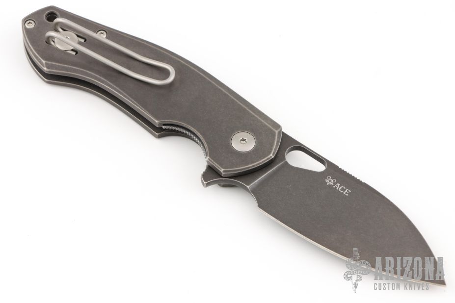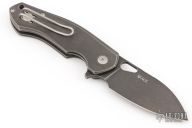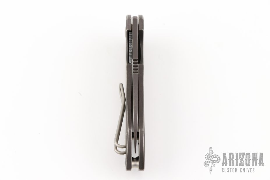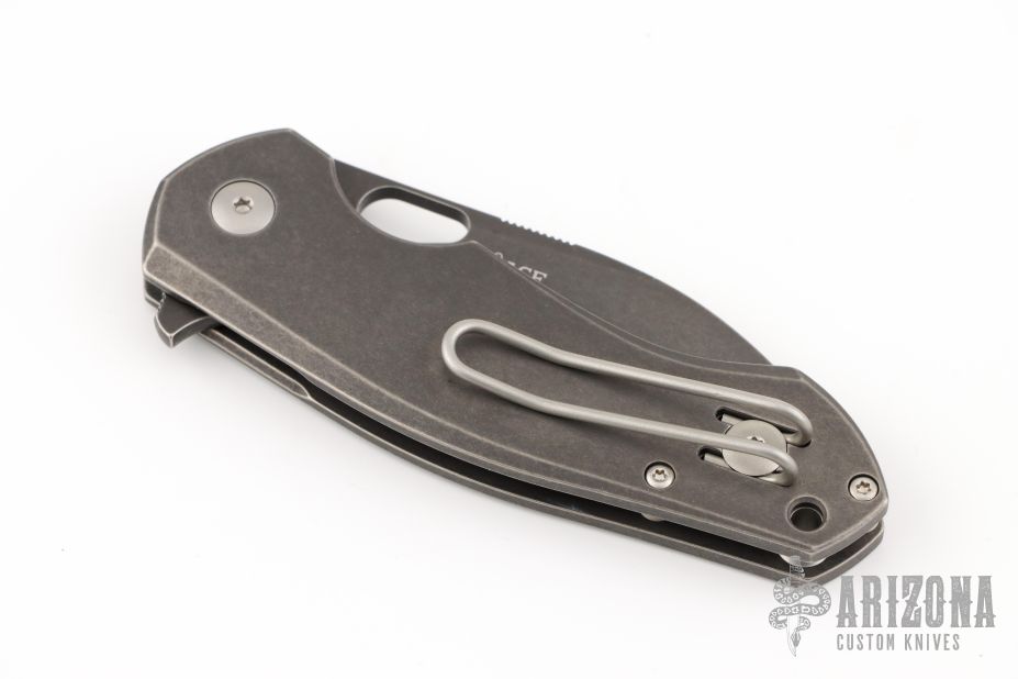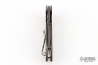 This AICE BIBLIO by Giant Mouse features a dark stonewashed drop point blade with thumbhole and notched thumb rest. The handle has a tumbled titanium frame with a stainless tip up pocket clip. Includes original box. Excellent Condition.