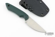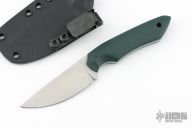 This Potámi by Boatright Bladeworks features a satin finished flat ground blade with .141" blade stock and 1.003" blade depth, full tang construction. The handle has green G-10 scales with a black canvas micarta pin and lanyard hole. Comes with a kydex sheath. Has a couple very light scratches, otherwise excellent condition.