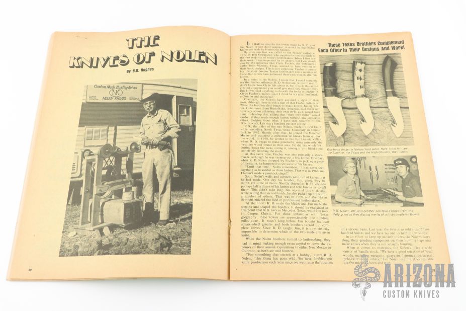 "A life long interest in hunting has given us an approach to knife making that comes from years of practical experience. My brothers and I were raised on squirrel dumplings in the piney woods of East Texas and we hunted from there to the Tundra of Alaska to the jungles of Mexico and the Rockies in between. In fact, our serious efforts in the field of knife making was started as a means to finance our hunts. Our father actually made the first "Nolen Knife" back in the 1930's, however, it wasn't called that. He just needed a good knife, so he made one. RD made the first knife in 1946 and over the next 20 years made a few more just to satisfy the desire to use a knife that was the result of his own handiwork. It wasn't until the late 1960's that we met Clyde Fischer and were introduced to the art of "Custom Knife Making". What an experience that was - to realize that there were still craftsmen in this world, like Clyde, who were making knives by hand and actually getting PAID for them! Since we were not machinist, or metallurgist, or even blacksmiths, we took our basic knowledge of knife construction and our many years of knife use in the field and went to work. After many trials and many errors and with the help of Clyde Fischer, Jimmy Lile and others, we have reached a point that we feel assures our customers of a quality product. However, we do not feel like we have made our best knife, YET. At least we hope we haven't. To stop improving would be a terrible thing. To give you a little insight into our knife making philosophy, we feel we should tell you our main objective of art, believe me, it is strictly secondary. We make our knives, first and foremost, to be used and abused by the American Sportsmen. We direct our efforts towards a blade that is functional, or a handle that really fits your hand and a sheath that protects you and your knife. Why? Because that is what really counts in that field. Not how shiny the blade is or how fancy the handle might be. Sadley we lost RD on March 4, 2010. Steve is carrying on the family business. He started working full time with his father in 1986, and has the same philosophy as RD. Steve has the same passion to achieve the high quality that Nolen Knives has always been known for his past."