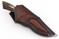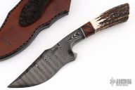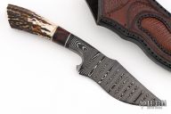 Another absolutely stunning piece from the Sobral brothers! This EDC knife features a Damascus clip point blade with false top edge, .304" blade stock and 1.4" blade depth, hidden tang construction. The guard is integral to the blade, with a beautiful stag grip, nickel silver, ironwood and carbon fiber spacers. This piece comes in an equally impressive, hand tooled, brown leather sheath and a leather zippered case. New from maker.