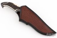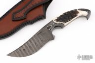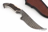 This hunter from the Sobral Brothers, is made from Damascus that has been forged into a beautiful finished product. It has a clip point recurve blade with a false top edge, .339" blade stock and 1.475" blade depth, full tang integral construction. The handle features very nice stag scales. Comes with a hand tooled brown leather sheath, and leather zipper case. New from maker!