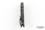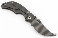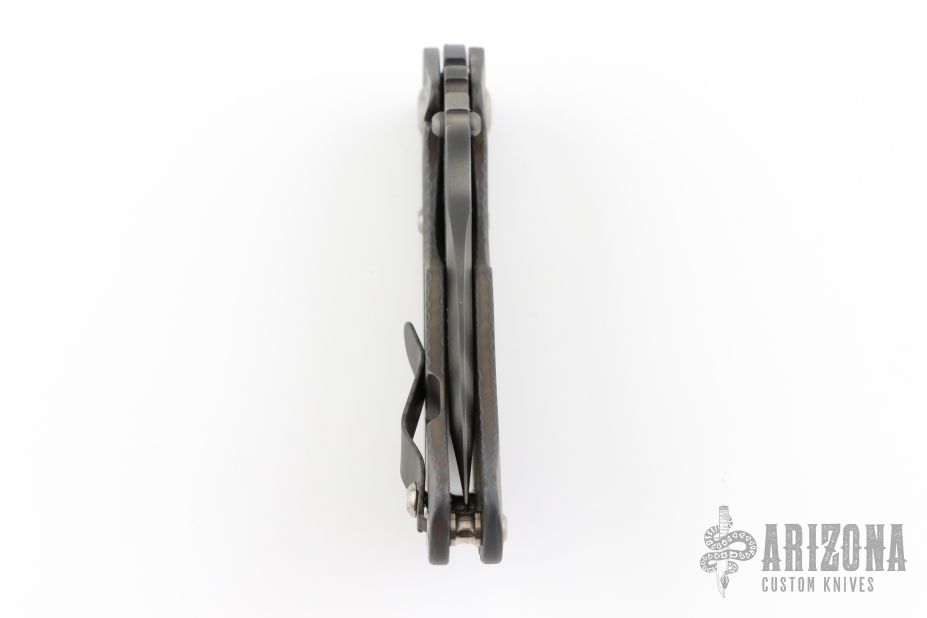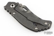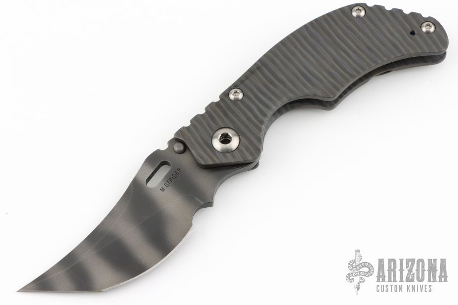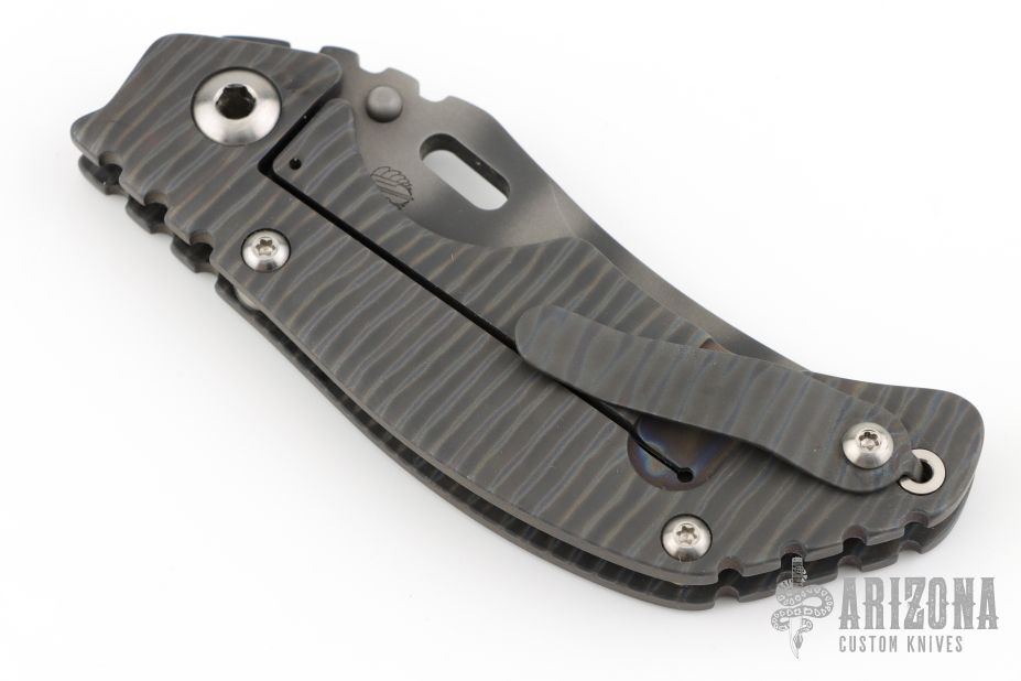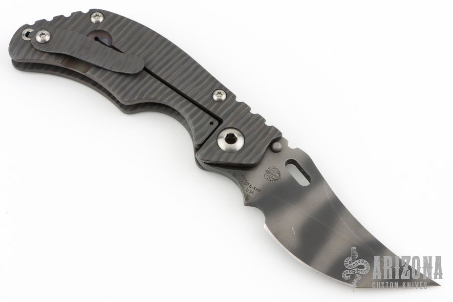 This KRT by Strider Knives features a tiger stripe upswept blade with thumbhole and notched thumbrest. The handle has a flame finished titanium frame with a matching titanium tip up clip. Nice detent, lockup and blade seating. Has a couple light scuffs, otherwise excellent condition.