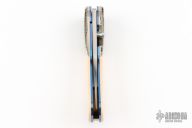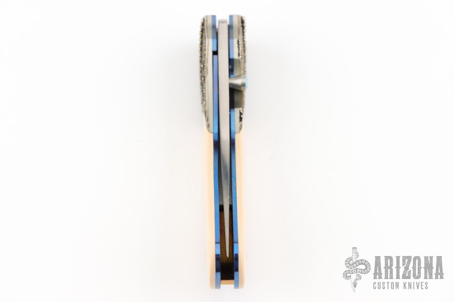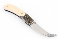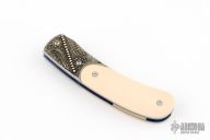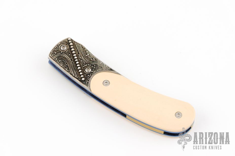 This Persian linerlock folder has a hand rub satin finished blade with a single thumbstud with opal inlay. The handle has silver filigree bolsters, ivory paper micarta scales, anodized titanium liners and backspacer with lanyard pin. Includes leather pouch. Excellent condition.
