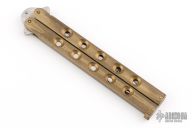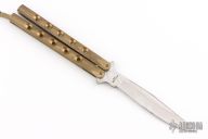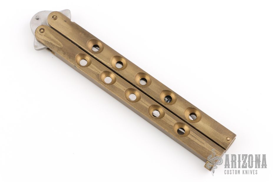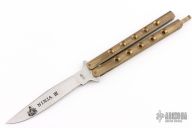 This balisong by Frost Cutlery features a satin finished blade. The handles are brass channel construction. Has a T-latch. Has some scratches, but otherwise good condition for its age!
