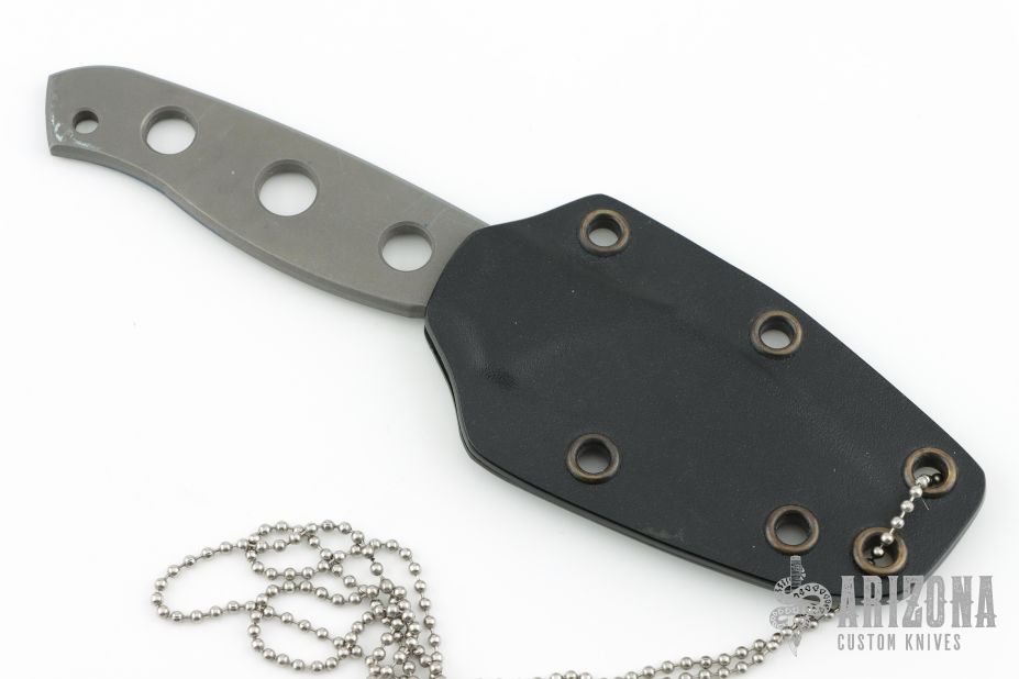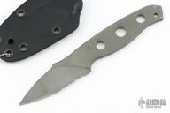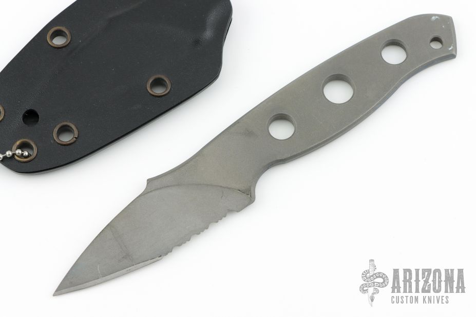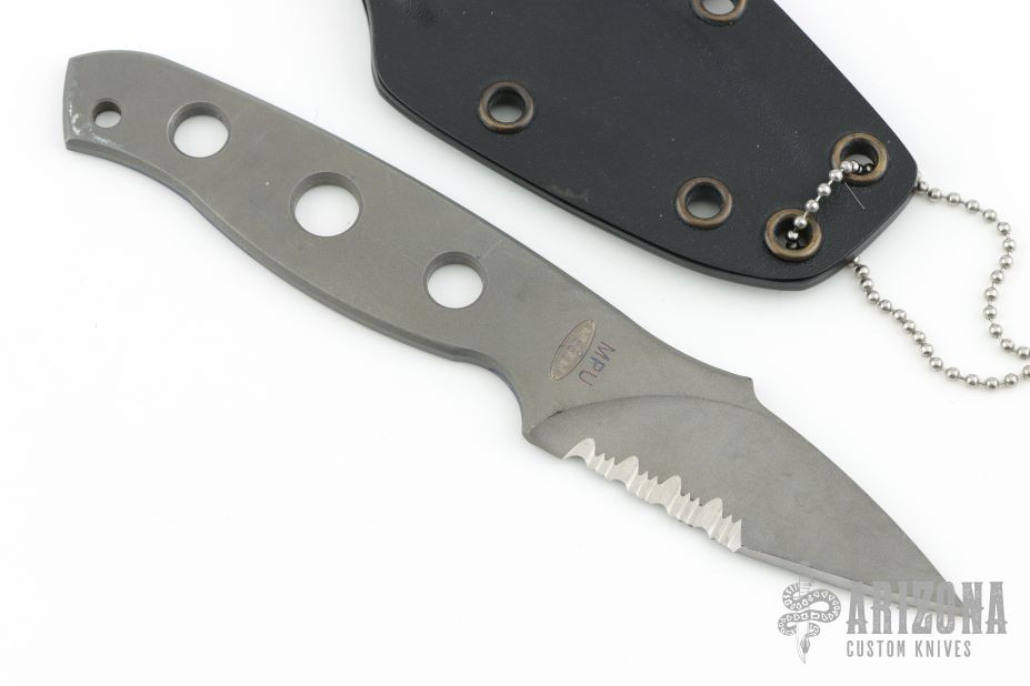 This MPU by Mission Knives is made from beta-titanium and is great for sports hobbyists; scuba divers, kayakers, backpackers, mountaineers, etc. It has a bead blasted partially serrated blade and handle with lanyard hole, .166" blade stock and 1.079" blade depth. Comes with a kydex sheath. Has scratches and scuffs, has some blue sharpie marker on the tang, otherwise good condition.