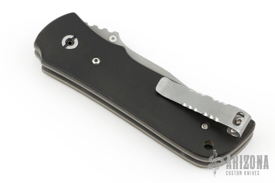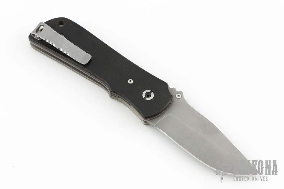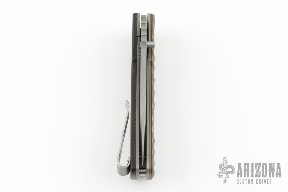 This knife by Coty Handley features a bead blasted blade with swedge, single thumb stud and notched thumbrest. The handle has camo G-10 and black canvas micarta scales, bead blasted titanium liners, stonewashed and fileworked stainless steel clip. Has some light scuffs, otherwise excellent condition.