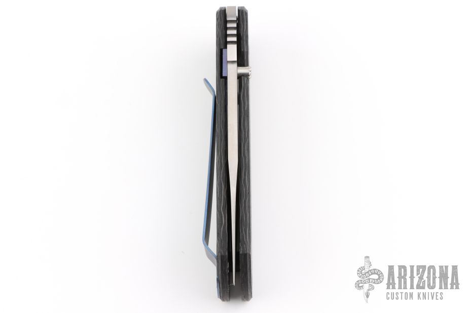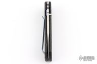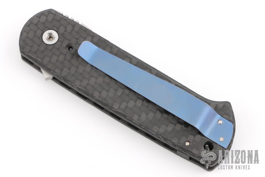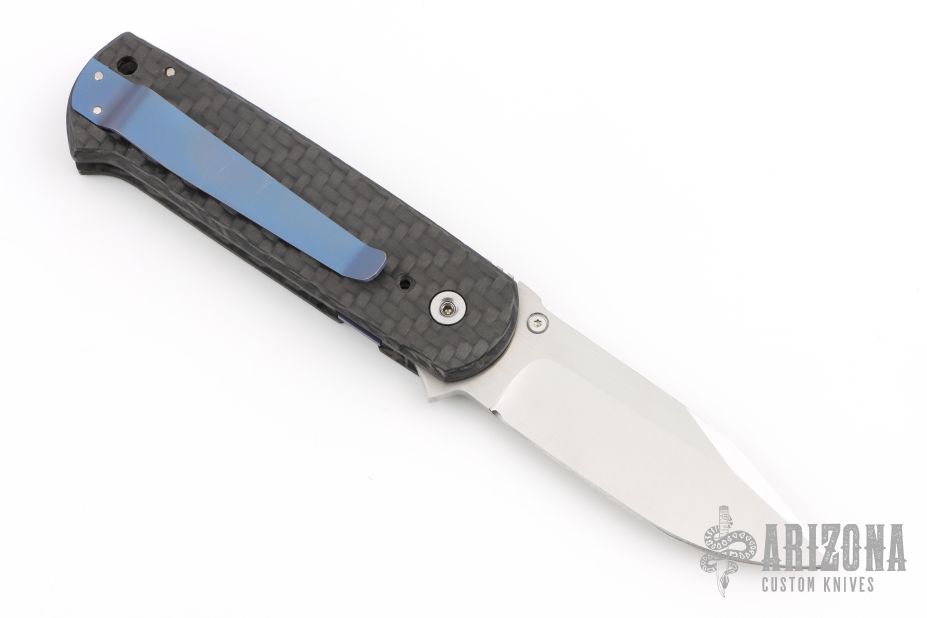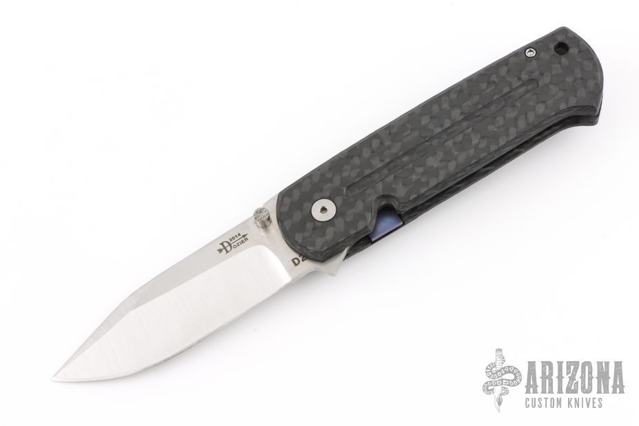 This Little Work Horse from Dozier knives features a satin finish clip point blade with single thumbstud, notched thumbrest and a flipper. The handle is comprised of carbon fiber scales with an andozied titanium liner and tip up pocket clip, carbon fiber backspacer. Lanyard hole in pommel. Has some scuffs on the clip, otherwise excellent condition. Dated 2014