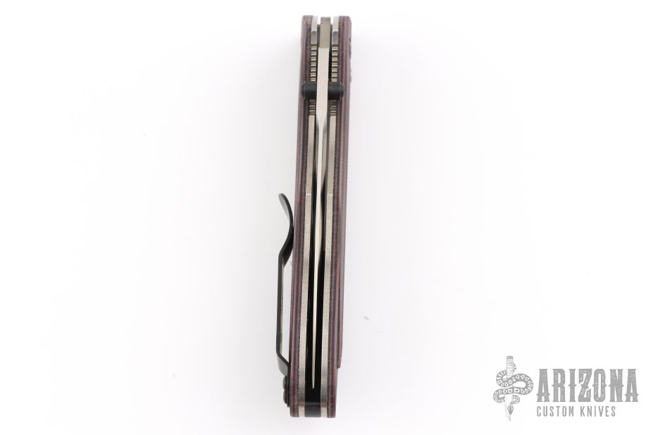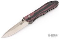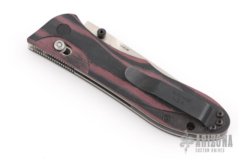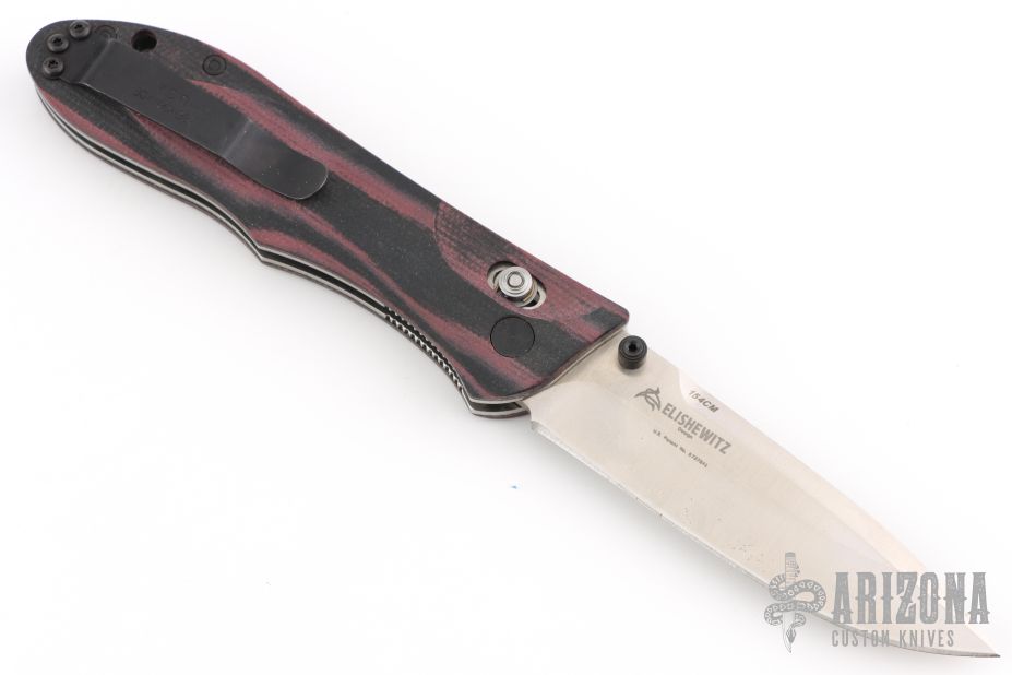 This axis locking folder by Benchmade features a satin finished spear point blade with dual thumbstuds. The handle has red/black G-10 scales, stainless steel liners with notched thumb-rest, and black stainless steel clip, tip up carry and reversible for right or left-handed carry. Comes with original box. Has some scuffs and light rust spots on the blade. Great condition otherwise.