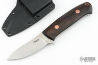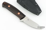 This knife from Dan Crotts features a satin finish up swept blade with a notched thumbrest. .126" blade stock and .982" blade depth. The handle has African Blackwood scales, copper pins and lanyard tube over full tang construction. Includes kydex sheath with belt loop set up for horizontal carry.  New from maker!