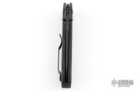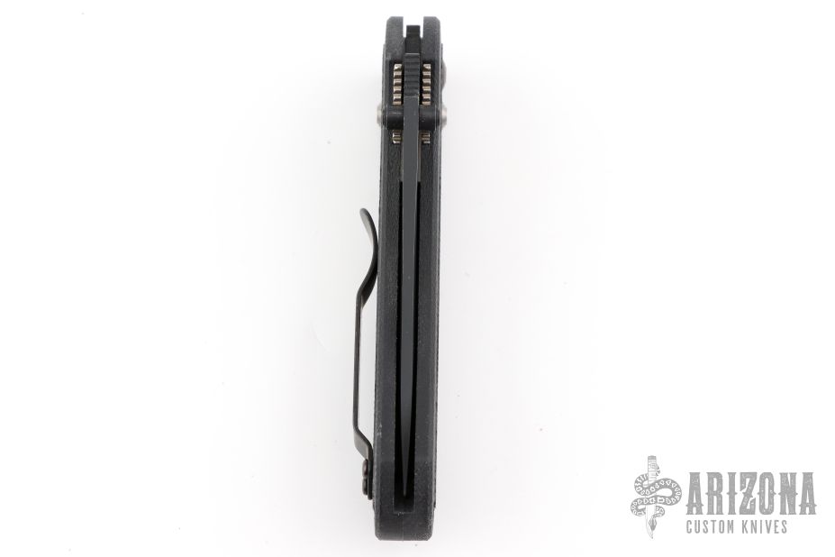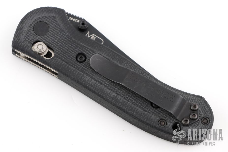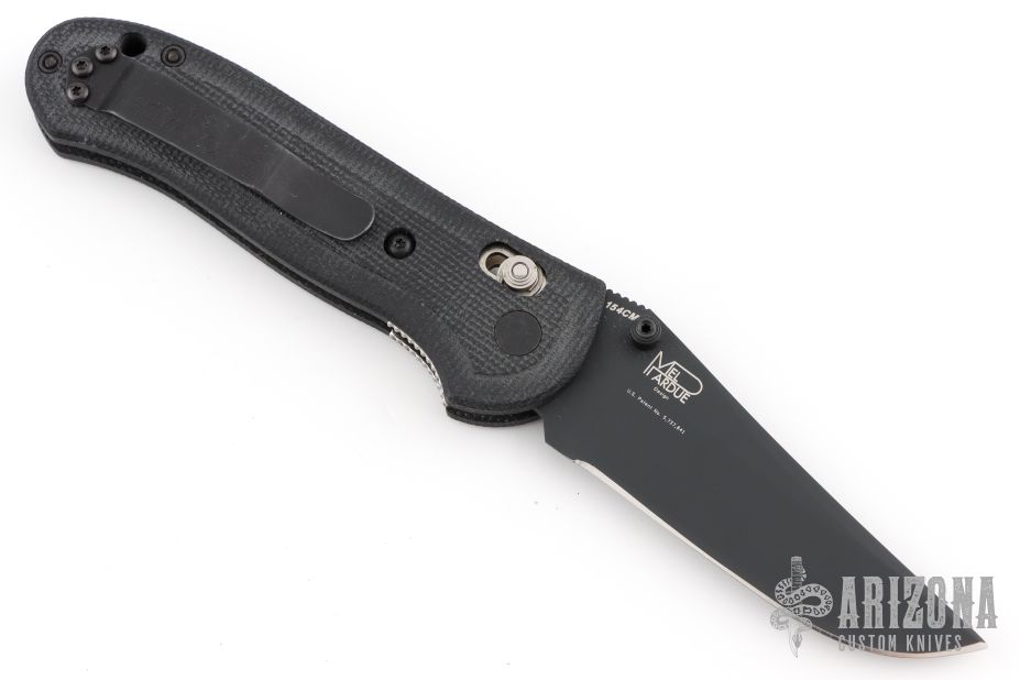 This folding bowie from Benchmade is a Mel Pardue design. It features a black clip point blade with dual thumbstuds, notched thumb ramp and false top edge. The handle is comprised of black G10 over stainless steel liners. Tip up carry stainless steel clip. Comes with original box and papers. Has some scratches on the clip. Excellent condition.