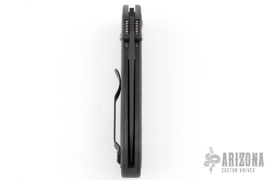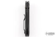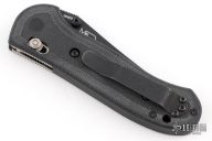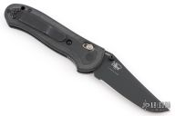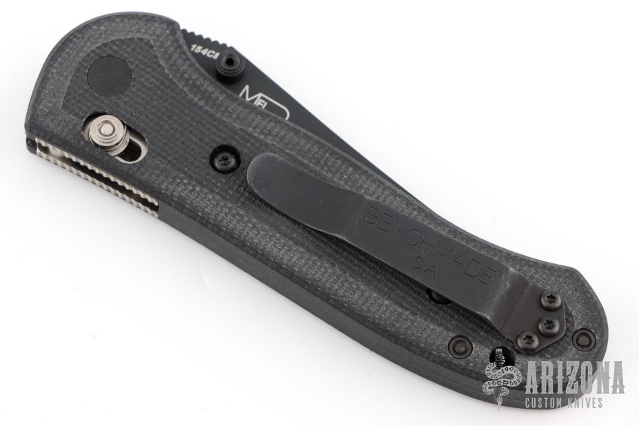 This folding bowie from Benchmade is a Mel Pardue design. It features a black clip point blade with dual thumbstuds, notched thumb ramp and false top edge. The handle is comprised of black G10 over stainless steel liners. Tip up carry stainless steel clip. Comes with original box and papers. Has some scratches on the clip. Excellent condition.