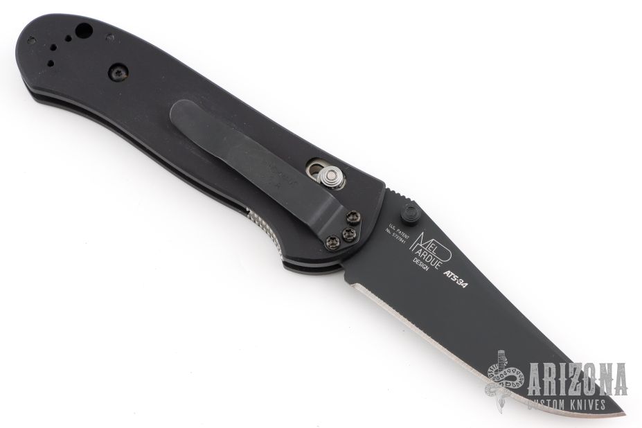 This folding bowie from Benchmade is a Mel Pardue design. It features a black clip point blade with dual thumbstuds, notched thumb ramp and false top edge. The handle is comprised of black aluminum covers over stainless steel liners. Tip up/down reversible carry stainless steel clip. Comes with original box and papers. Has some light scuffs, excellent condition.