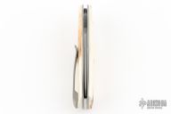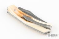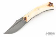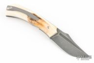 This "Small Inglorious" Slipjoint by David Breniere features an acid tumble finished blade with notched thumbrest, fullers and false top edge. The handle has warthog tusk covers, blasted stainless steel liners, satin stainless steel spring, tip up bead blasted titanium clip. Has half-stop, flush in all positions. Comes with a Velcro case. Excellent condition.