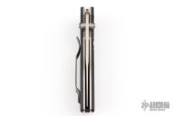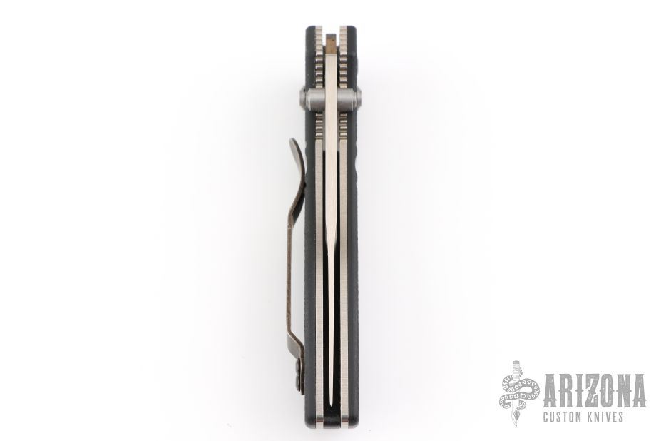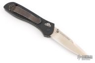 McHenry & Williams design. Axis lock. Satin finished blade with dual thumbstuds. The handle has black G-10 scales with stonewashed stainless steel liners, black backspacer and a tip up stainless clip, left or right reversible. Discontinued model. Comes with original box and papers. Has some scratches on the clip, and some wear on the hardware. Great condition otherwise.