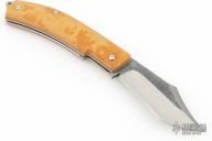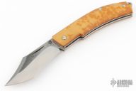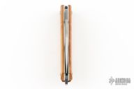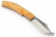 This Slipjoint by David Breniere features a hand rub satin finished blade with nail nick. The handle has vintage paper micarta covers, titanium liners, stainless steel spring. Has half-stop, flush in all positions. Comes with a zippered case. Has a very small scratch on the blade, otherwise excellent condition.