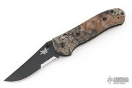This folding bowie from Benchmade is a Mel Pardue design. It features a black, serrated clip point blade with dual thumbstuds, notched thumb ramp and false top edge. The handle is comprised of Camo covers over stainless steel liners. Tip up/down reversible carry stainless steel clip. Comes with original box, belt sheath, and papers. Has some scratches on the clip. Excellent condition.