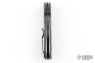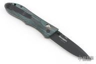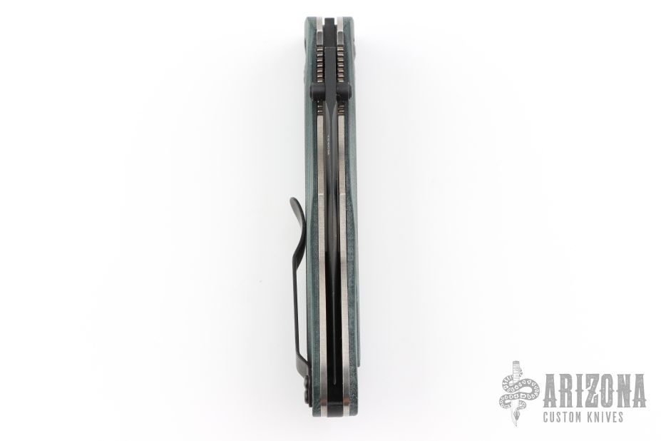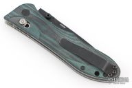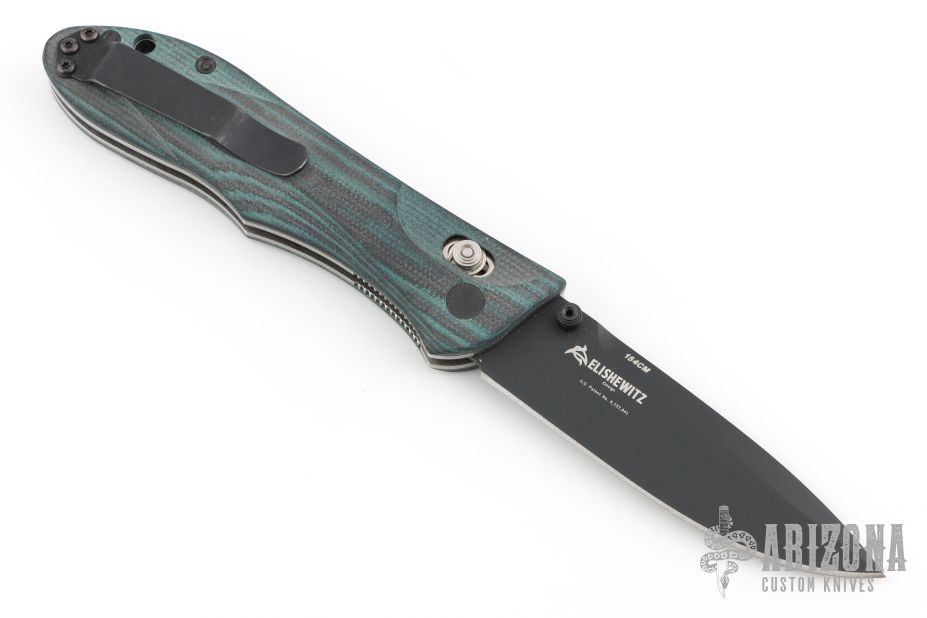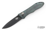 This Benchmade 735 Ares features a black finished spear point style blade with dual thumbstuds.  The handle has black/green G10 scales over steel liners with a black steel pocket clip.  Includes the original box and papers. Has some scratches on the clip. Excellent condition.